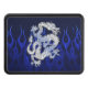 A Dragon applique in chrome like silver style on a navy blue flames carbon fibre background print to wear or to share on all festive occasions.