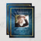 Un programme élégant de 2 pages. Un ciel bleu foncé comme arrière - plan, un cadre faux or, et espace pour une photo. Poutres lumineuses derrière la photo. Personnalisez et ajoutez le nom, les dates et votre texte.