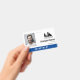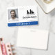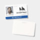 Office employee badge with a clean minimalist design in black, blue, and white. Add a photo of the employee along with name, personal pronouns, and profession. Personalize further with your business logo.