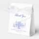 This elegant wedding favour box features a white background with an illustration of a colonial revival style/plantation house/manor/mansion with a fountain and trees in blue. Personalize it for your needs. You can find matching products at my store.