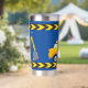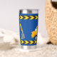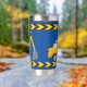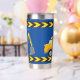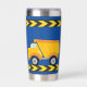 Cool custom construction excavator tumbler gift for a child who loves yellow construction vehicles in blue, black and yellow. Fun vehicle gift for a little boy who loves cars and trucks. Customize with your kid's name under the black and yellow caution tape. The back features a dump truck.