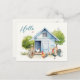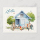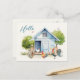 Carte postale avec poulailler et message et adresse imprimés en option. Le grand texte "bonjour" sur l'avant est imprimé dans le coin supérieur gauche sur un dessin de coop bleu de poulet mignon. Des arbres verts d'été piquent derrière la maison du poulet, avec des poulets et du coq dans la cour.Parfait pour rester en contact avec des amis, customisez avec un message personnel sur le dos. Ajoutez également une adresse postale au modèle fourni, ou supprimez l'exemple de libellé pour commander en blanc.