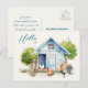 Postcard with chicken coop and optional printed message and address. Large "hello" text on the front is printed in the upper left corner over a cute, blue chicken coop design. Summer green trees poke from behind the chicken's house, with chickens and rooster in the yard.Perfect for keeping in touch with friends, customize with a personal message on the back. Also add a mailing address to the template provided, or delete the sample wording to order blank.