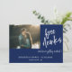 The Blue Couple Photo Wedding Save the Date is a bold and romantic design that beautifully highlights your love story. Featuring your favourite couple photo as the focal point, it’s paired with deep navy blue accents for a touch of elegance and passion. The rich colour palette creates a warm, timeless aesthetic that’s perfect for fall, winter, or evening weddings. Minimalist yet stylish typography ensures your names and date stand out clearly against the luxurious background. The photo-centred layout makes it deeply personal, while the navy blue tones add sophistication and charm. Printed on premium cardstock, it delivers both durability and a polished finish. This save the date card effortlessly sets the mood for a romantic and memorable celebration. A striking way to announce your wedding day with style and intimacy.