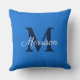 This is a cool southwest style reversible pillow design. On the front is a light blue coyote howling at the white crescent moon on a dark blue background. On the back in matching colours is a monogram with name in two fonts for you to personalize. The large letter is in the dark blue block font, the name in white script and the background is the light blue. Designer tip: order them in pairs so you can display both sides at once. #westernart