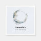 Paper napkins with a mystical illustration. A dark blue crescent moon with a elegant thin circle outline and white flower blossoms along its edges.