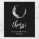 Birthday bottle labels with a mystical illustration. A dark blue crescent moon with a elegant thin circle outline and white flower blossoms along its edges.