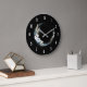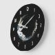 A clock with a mystical illustration. A dark blue crescent moon with a elegant thin circle outline and white flower blossoms along its edges.