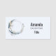 A name tag with a mystical illustration. A dark blue crescent moon with a elegant thin circle outline and white flower blossoms along its edges.