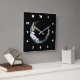 A clock with a mystical illustration. A dark blue crescent moon with a elegant thin circle outline and white flower blossoms along its edges.