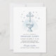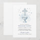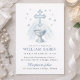 This beautiful baptism invitation features a serene blue watercolor design with a prominent cross and a font bowl, surrounded by gentle stars. The soft blue hues and delicate details create a peaceful and spiritual atmosphere, perfect for celebrating your child's special day. It is ideal for announcing a baby boy's baptism, christening, or naming ceremony. The elegant script for 'Reception to follow' adds a touch of sophistication to this commemorative piece.