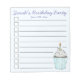 List-style shopping checklist note pad design features an original marker illustration of a cupcake topped with sprinkles and a candle, printed on a blue background. Just personalize with your birthday party information for a fun favour.