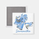Custom blue, white, and silver tone school cheerleader magnet, with great looking graphics of a cheerleader's uniform, megaphones and pom poms. Custom blue text, on the bottom, is ready to personalize with your name or any text you want. Great for home or in your school locker.