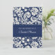 Bridal shower invitations in elegant dark navy blue and cream off white classic floral damask pattern, elegant and feminine, customizable with your shower details. Also available in thank you cards and invitations for the bridal party.