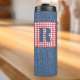 A blue denim print on this trendy 12oz thermal tumbler with red and white check frame and a large blue initial. Easily change initial with the Template provided. Stainless body, plastic lid. Vacuum-sealed double walled construction retains temperature, hot or cold. Fabulous, personalized gift for anyone who likes the denim and red-white gingham style. See "About This Product" at side for more information and care.