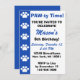 This invitation displays a blue stripe with white paw prints and the text "PAW-ty Time! You're invited to celebrate..." These are great invitations for paw print themed, dog themed, puppy themed, cat themed, or animal themed birthday parties for children.