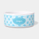 Blue dog paw print pattern with a blue badge that has a personalizable text area for the name of the pet. The font is a lovely script font in white colour.