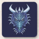 Blue dragon coaster featuring a digital illustration of this cool magical creature's head with horns in purple and blue colours over dark blue background.