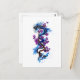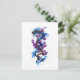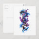 a colourful artwork featuring a blue coloured mythical dragon or lizard with purple coloured blossoms growing from a tree branch on a postcard.