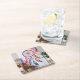 This coaster shows a close-up digital photo of a decorative dreamcatcher hanging in a cozy living room setting. The dreamcatcher features a turquoise blue circular web with a pink and blue geometric pattern in the centre. The web is adorned with multiple feathers in pastel colours of light blue, pink, purple and turquoise arranged symmetrically. . The coaster is a paper pulp coaster that is 4" by 4" square. The coasters are sold as sets of 6 coasters. Stock up today and never see a water ring again! The coasters are tough, durable and absorbent -- perfect for parties, weddings or branding your business.