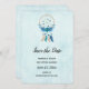 Save the date card with a pretty watercolor dreamcatcher. Blue, turquoise and cream colours. Decorated with feathers, beads and flowers.