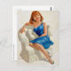 Classic PinUp card showing a beautiful PinUp Girl in a hot blue dress sitting on a sofa, painted by Arthur Sarnoff (1912-2000)