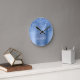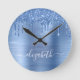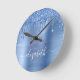 Personalized elegant and girly clock featuring blue faux glitter dripping down a blue faux metallic foil background. Monogram with your name in a stylish trendy white script with swashes.