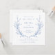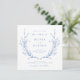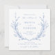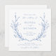 Minimalist blue and white wedding invitation, elegant hand illustrated botanical leaves wreath, with event details in modern script and classic font. Simple and luxury. Great for modern classic wedding, simple formal wedding, elegant botanical garden wedding.