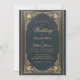 This elegant wedding invitation with a vintage air, recommended for a more formal, "black tie" wedding, has a vintage golden frame with elegant baroque gold decorations on a dark blue leather-like background. The names of the bride and groom and the word Wedding are written in an elegant calligraphic script. All text can be personalized and has a golden colour similar to the vintage golden frame.