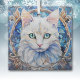 A beautiful long haired white cat with vivid blue eyes is the feature on this pretty stained glass style ornament. The cat is framed in an ornate round, tan frame against the blue mosaic background.