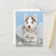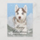 Blue eyed husky puppy sitting in snow holiday postcard