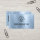 This business card design features a cool, brushed metallic blue background, offering a sleek and contemporary appeal. Your custom logo and company name are prominently displayed on the front in a crisp dark font, while the reverse side efficiently showcases contact details and a QR code, all designed for clear readability and a professional impression. This modern aesthetic ensures your business stands out with understated sophistication.