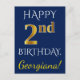 This simple, personalized birthday postcard design features the message "HAPPY 2nd BIRTHDAY", with the "2nd" having a faux gold-like appearance. The front also features a custom name, and a blue background. The back features a custom birthday greeting message, along with the customizable address of the birthday postcard recipient. It could be sent to somebody who is celebrating their second birthday. [~Z0000074]