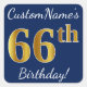 Blue, Faux Gold 66th Birthday + Custom Name Square Sticker