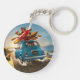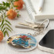 Hit the road with charm and style. This vibrant keychain features a blue Fiat car speeding along a scenic coastal road, loaded with holiday gear on the roof with canoes, paddles, and deck chairs, ready for adventure. The cheerful "CIAO" on the license plate adds an Italian flair.