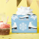 Christmas wrapping paper for figure skaters with a blue background, white snowflakes, and figure skates in a repeating pattern! Perfect for Christmas, birthdays, or any other occasion!