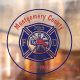 Window cling features blue Fire Department badge style logo with red centre helmet and customizable text in red casual font