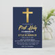 Celebrate your child's special day with these stylish and sophisticated first communion invitations. Featuring a beautiful navy blue watercolor background, a delicate cross design, and a touch of gold foil, these invitations are perfect for a modern, elegant celebration. The design is customizable to match your event's theme and colour palette.