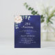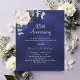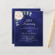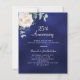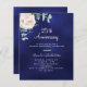 A navy blue, uneven coloured background. Decorated with a white floral, peony flower and green watercolored eucalyptus greenery. Personalize and add your names and the details.
