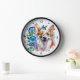Tucked into this watercolor arrangement of blue and purple flowers and green leaves is a beautiful image of a Pembroke Welsh Corgi Dog. Dark grey numbers and markers around the perimeter make this clock easy to read. Everything is placed on a white background.