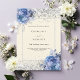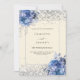 A cream coloured background decorated with blue roses, flowers and faux silver confetti. Personalize and add your names and wedding details. Black letters.