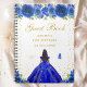 This elegant and glamourous birthday party guest book features a beautiful princess with dark hair and dark skin in a royal blue ball gown. The text combines handwritten script and modern sans serif fonts for a classy and sophisticated look. The floral arrangements, butterflies and gold confetti create the perfect blend of rustic and chic.