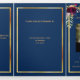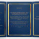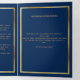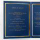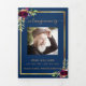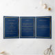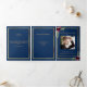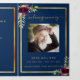 An elegant tri-fold program. A navy blue background, a faux gold frame, burgundy florals and space for your photo. Personalize and add name, dates and your text.