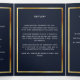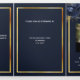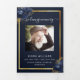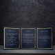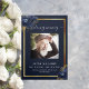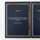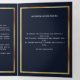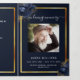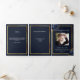 An elegant tri-fold program. A navy blue background, a faux gold frame, blue florals and space for a photo. Personalize and add name, dates and your text.