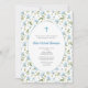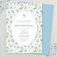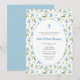 Blue floral baptism invitation in Grandmillennial style features beautiful blue and green watercolor blossoms with an oval shape for your text. This invitation provides room for the baptism location and time along with room for a celebration after the ceremony and RSVP info.