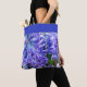 Fun floral tote bag with the cheer of spring blooms. Photograph of blue hyacinths in bloom on the bag, with a blue border. Pretty, feminine design. Lovely bag for those who adore blue and purple flowers. Available in choice of sizes.