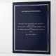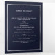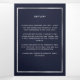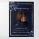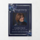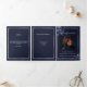 An elegant tri-fold program. A navy blue background, a faux silver frame, blue florals and space for a photo. Personalize and add name, dates and your text.