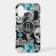 Grey skulls and teal blue flowers are the feature on this phone case. At the centre is a round banner lined in matching silver, with your monogram also in silver. A curl of silver stardust is laid over the top half of the design. Unique!