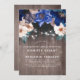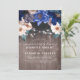 Rustic floral engagement party invitations with string lights and navy and royal blue flowers bouquet