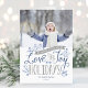 Affordable custom printed holiday photo cards with a simple template for customization. This cheerful design features whimsical floral elements and fun hand-lettered style typography in winter blue and grey colours. The text reads "May your heart be filled with the love and joy of the holidays". Personalize it with your photo, names and the year. Inside has space for additional photos and text. Use the design tools to edit the text fonts and colours or add more photos to create a unique one of a kind Christmas photo greeting card.